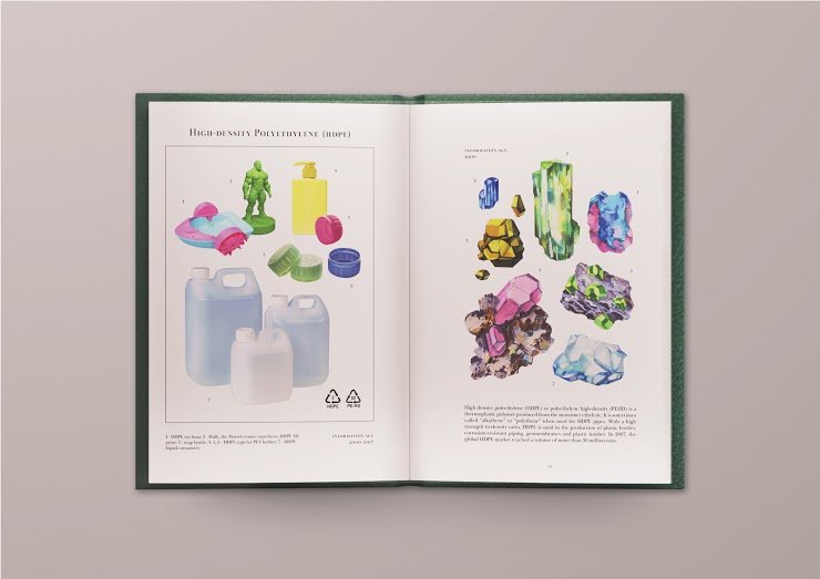 The project began with the idea to put an underappreciated material on a pedestal, in an attempt to make it seem luxurious, and, thus, affect people’s opinion on it. I chose plastic because it is a material the value of which has changed a number of times throughout history; the story of plastics is one that reflects the story of humankind itself. By looking at plastics from an archaeological point of view, I imagine a future where plastics are no longer produced and become a resource found underground, a relic of long gone days. Already today, the earliest items in this material, not being made anymore, are seen as luxury goods, while, at the same time, we carelessly bin plastic wrappings every day, only proving that scarcity is luxury. The project resulted in an encyclopedia that I call The Cabinet Of Anthropogenic Specimens, where I present plastics as gemstones dating back to the era of Anthropocene to educate our future and present selves about the different types of this man-made fossil that will be ‘found’. By portraying plastic as a valuable jewel, I hope to make us see it as such, to reconsider its application as disposables and question our throwaway attitude.