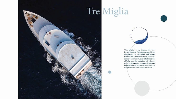 “Tre Miglia” is a system that aims to combat hydrosphere pollution by exploiting the habits of the human being that flies over the waters, through the creation of an innovative circular business to business system, which includes two different industrial sectors such as manufacturing companies and fishermen, and through the introduction of a tool capable of raising the capacity of man and his boat to capture microplastics present in the seas.