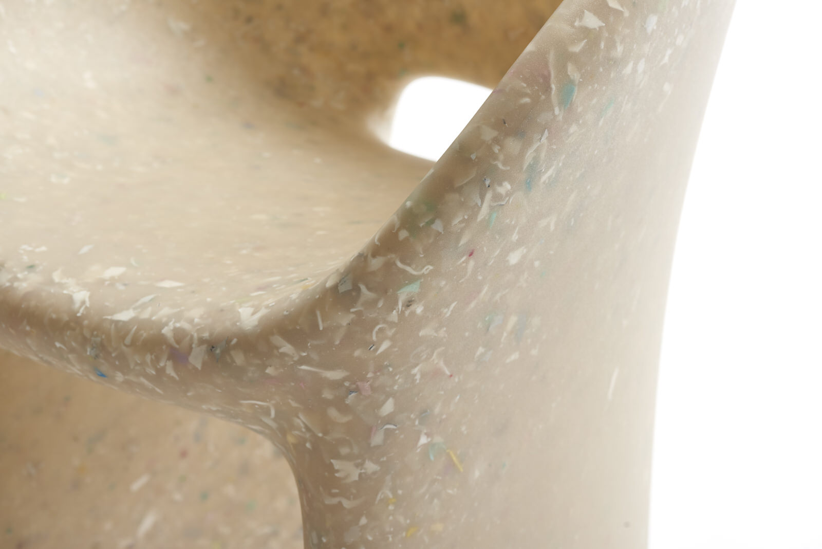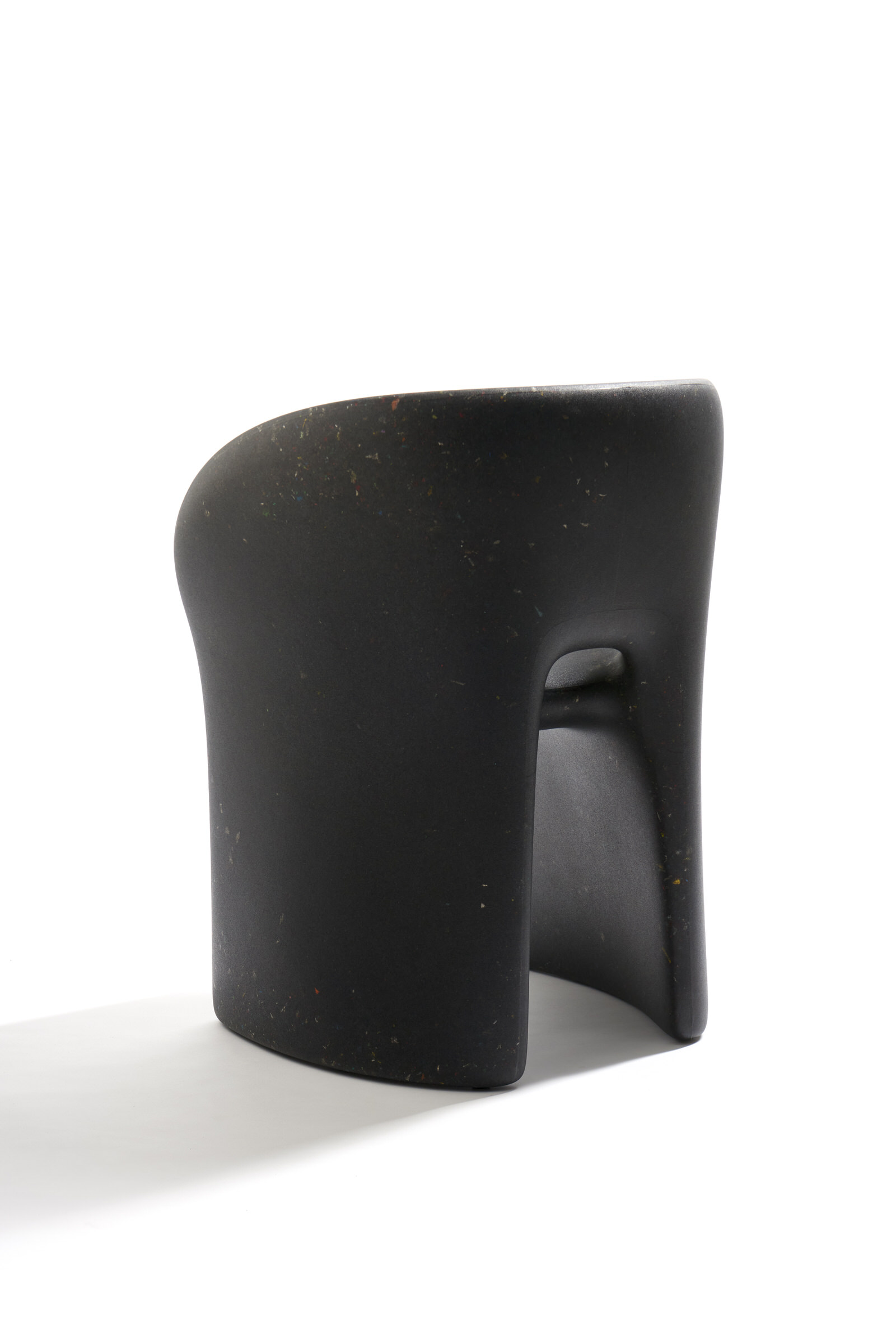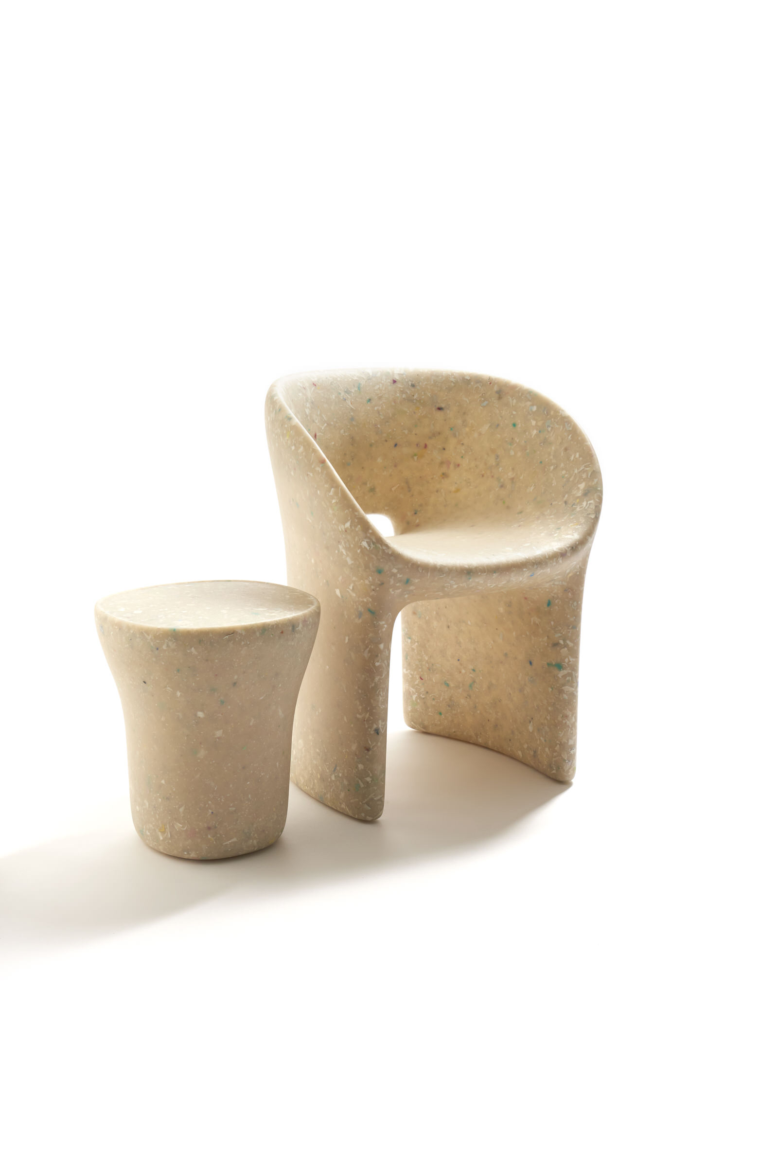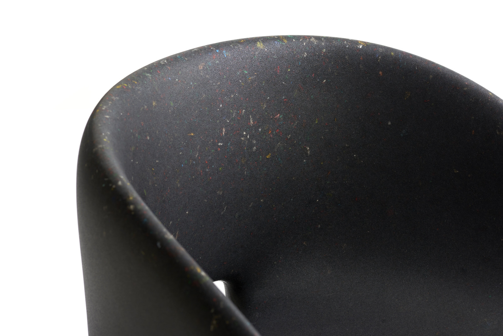 Armchair Richard and Table Judy are both reinterpretations for adults of ecoBirdy’s award-winning furniture for kids’ chair Charlie and table Luisa. Both products feature ecoBirdy’s distinctive speckled look making waste material beautiful. The recycling process is an integral part of ecoBirdy’s design process. Due to accurate sorting, cleaning and grinding during the recycling process, post-consumer plastic waste is transformed into valuable material while retaining character and memory of the previous product life. Both products are specially designed taking into account the specific properties of recycled plastic in production. Not only the appearance of the material is characteristic, but also the rounded shapes contribute to its materialization.