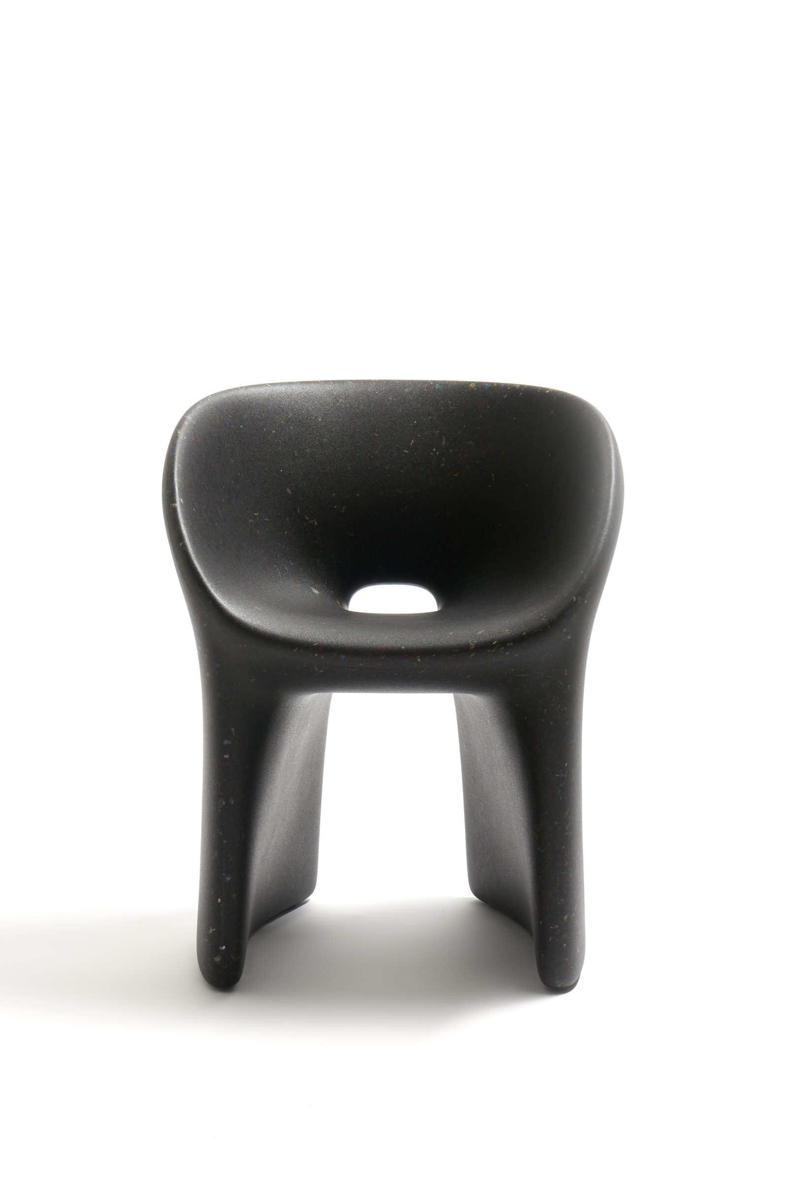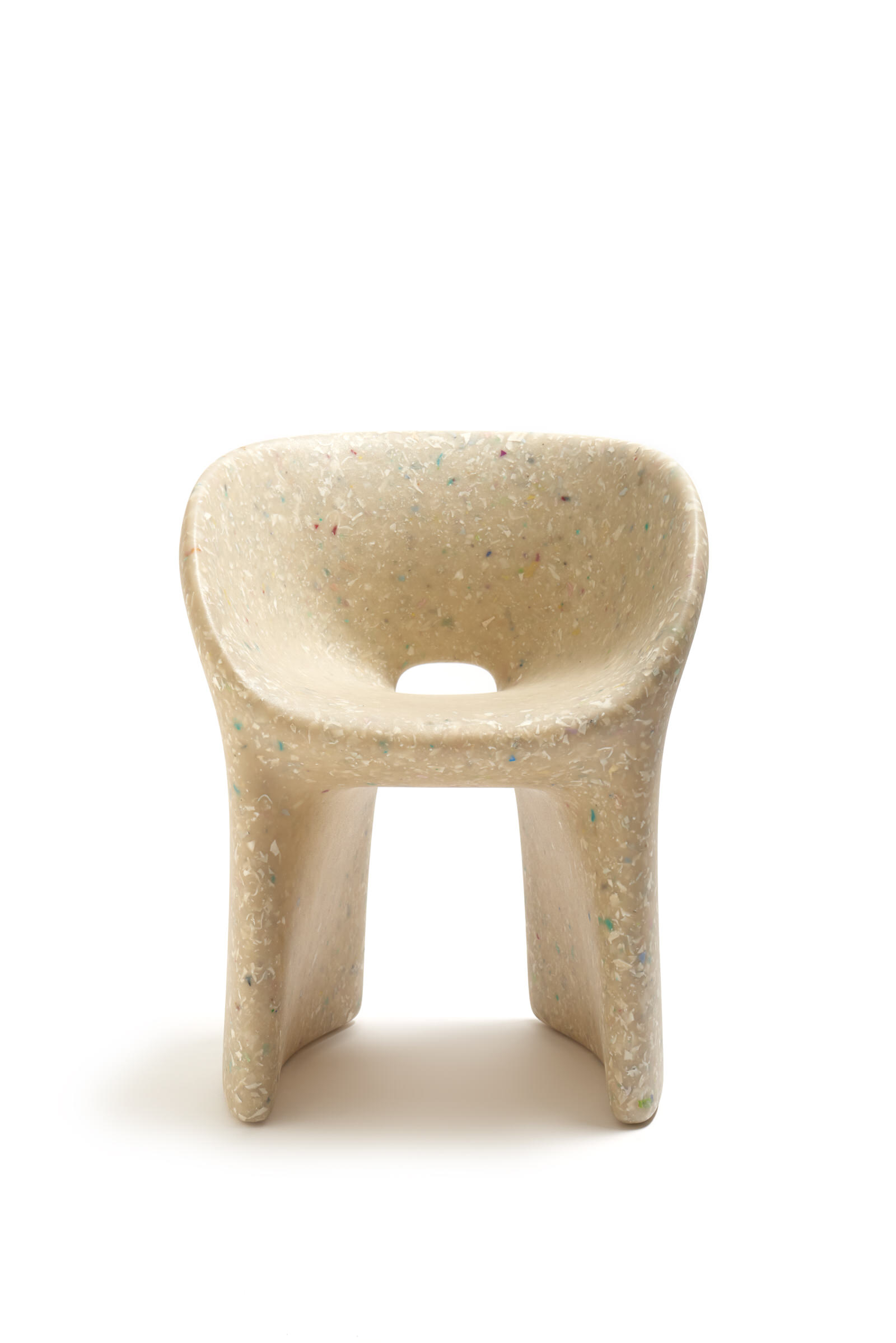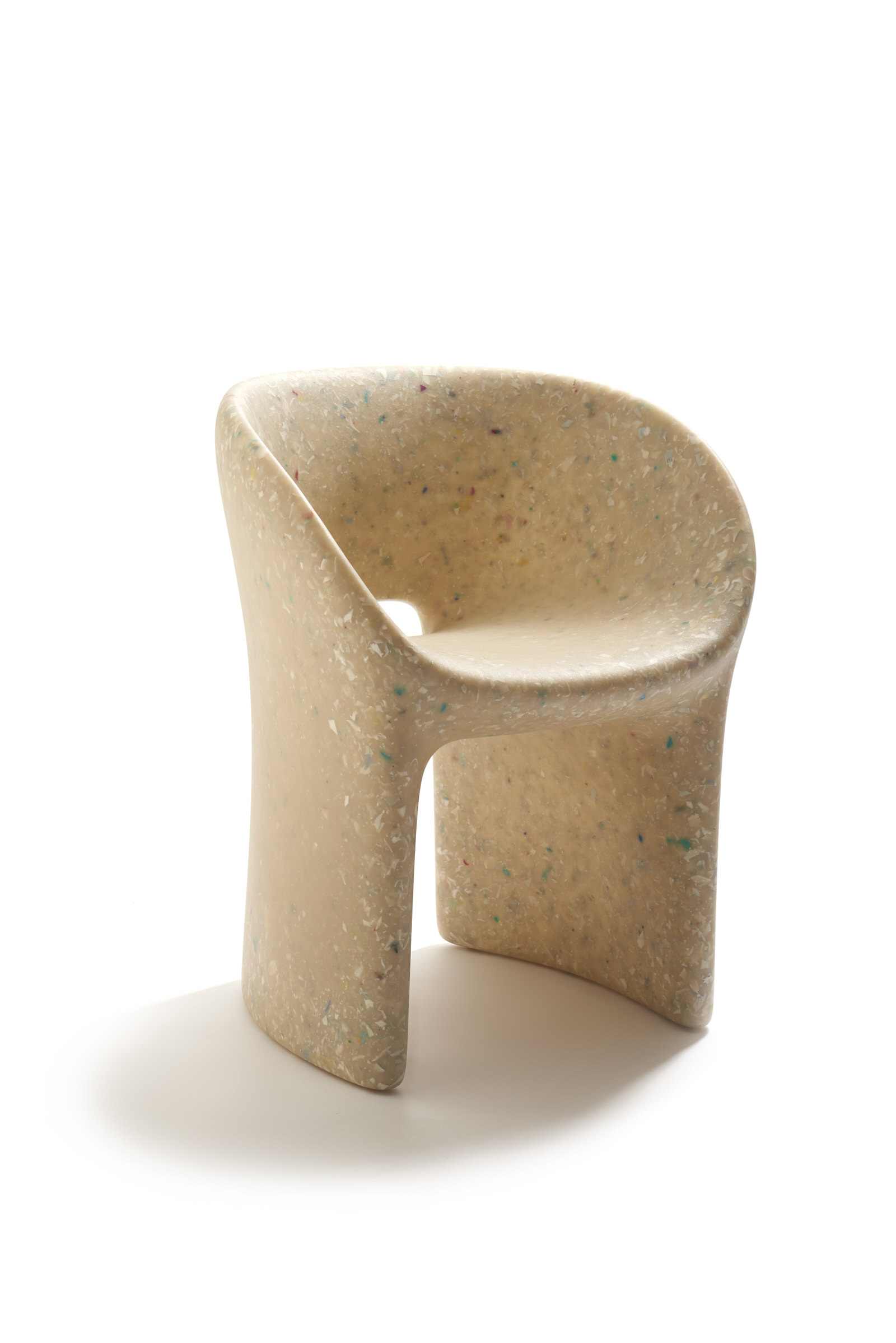Armchair Richard and Table Judy are both reinterpretations for adults of ecoBirdy’s award-winning furniture for kids’ chair Charlie and table Luisa. Both products feature ecoBirdy’s distinctive speckled look making waste material beautiful. The recycling process is an integral part of ecoBirdy’s design process. Due to accurate sorting, cleaning and grinding during the recycling process, post-consumer plastic waste is transformed into valuable material while retaining character and memory of the previous product life. Both products are specially designed taking into account the specific properties of recycled plastic in production. Not only the appearance of the material is characteristic, but also the rounded shapes contribute to its materialization.