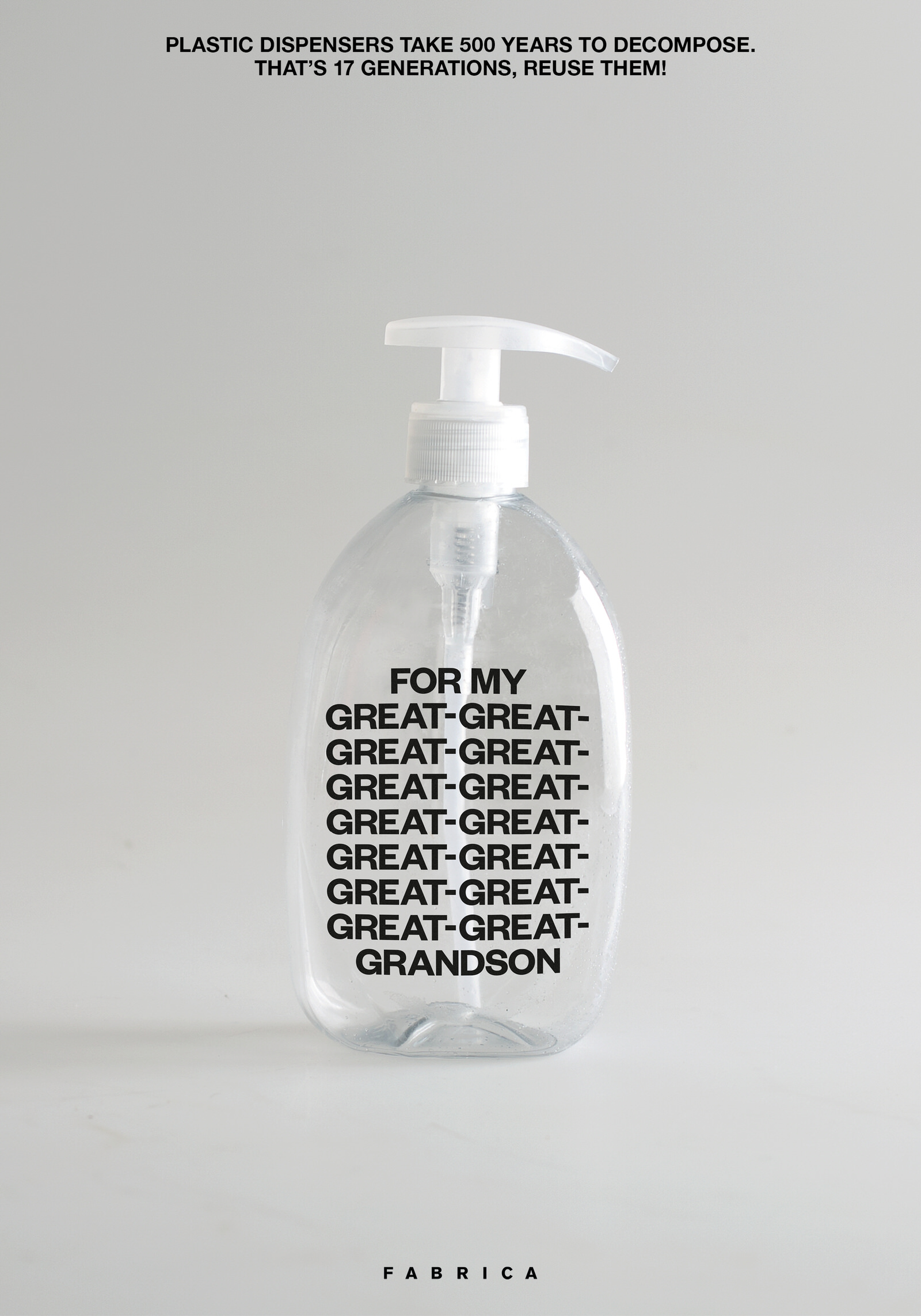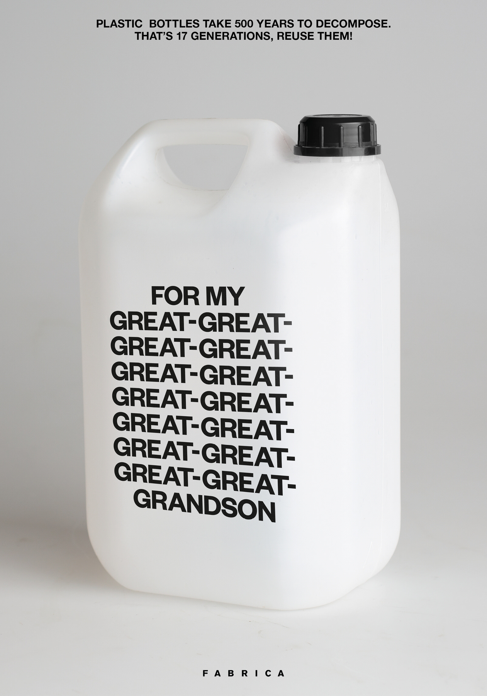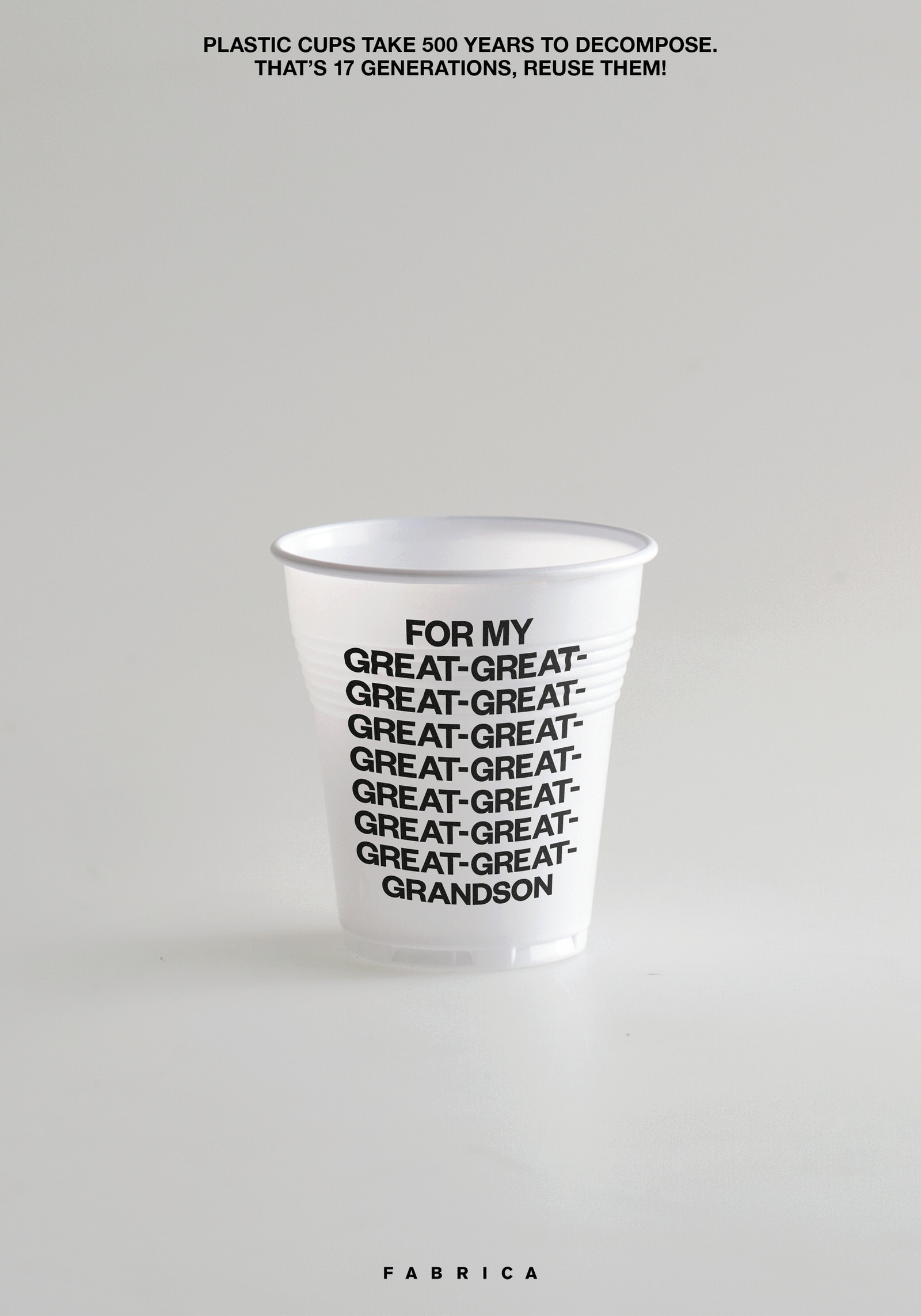 Four-poster campaign showing the incoherence of using plastic objects only once. Proposing to the viewers to use them repeatedly, thus making a better use of plastic lifespan.