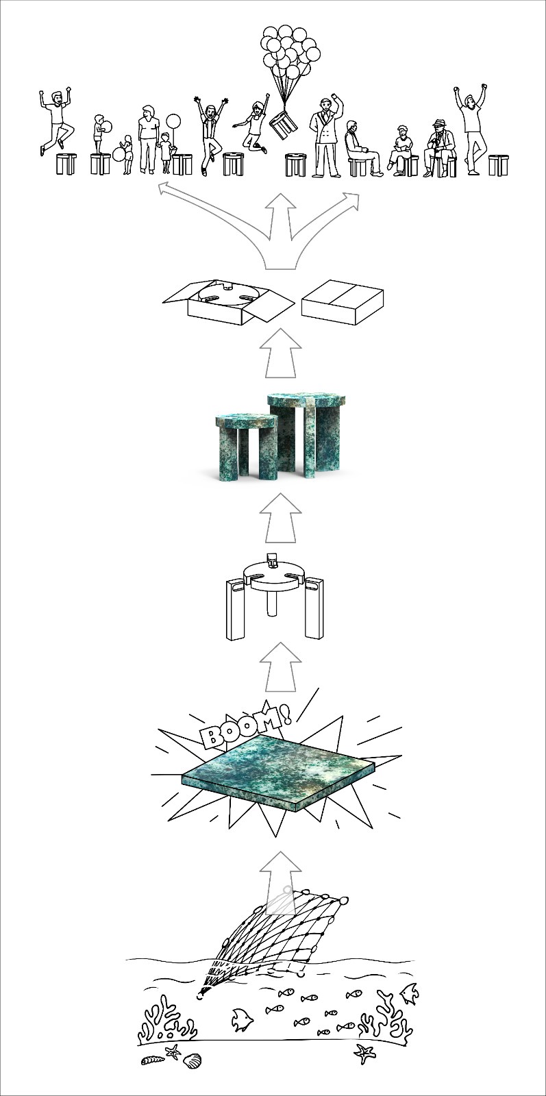Ghostbuster Universal Stool is a social innovation in which design is merely a tool to catalyze the process of cleaning the sea from ghost nets. The design of a 100% recycled plastic flat pack table aims to reach the widest possible audience. Entirely made of recycled PE, coming from collected ghost nets the stool has been designed with longevity in mind. Each year up to 12 million tonnes of plastics end up in the seas and oceans of the world. There is one type of plastic pollution that is especially deadly, because it is designed to capture and kill marine wildlife. Abandoned, lost or discarded fishing gears, or so-called “ghost nets”, are the silent killers under the surface – uncontrollably catching fish, marine mammals and birds, while simultaneously polluting the water with plastic particles. FAO report from 2009 estimates that 640,000 tonnes of fishing gear are lost or abandoned in the seas and oceans each year. This constitutes about 10% of all plastic waste in the oceans and is estimated to account for about 46% of the Great Pacific Garbage Patch. In 2020, the MARE Foundation, a Polish NGO focused on marine conservation, in partnership with the Kołobrzeg Fish Producers Group had retrieved over 3 tonnes of ghost nets from the Baltic Sea. This was only the beginning of the journey. Once retrieved from the water, there is no established course of action what to do with the nets. They are usually considered hazardous waste and are stored in ports or disposed of in an unsustainable manner. And while there are some companies in the world that specialize in recycling the ghost nets – the recycling process is not always clear, the final products usually contain only an admixture of nets and the designs do not follow the principles of circular economy. Facing this difficulty, Studio Rygalik together with MARE foundation and Boomplastic took on actions to find a sustainable way to recycle ghost nets and to create a product that makes the society aware of and responsive to the ecological issue facing the Baltic Sea and all other marine ecosystems worldwide. Design empowering conscious consumption that fuels cleaning up the waters. This is how the Ghostbuster Universal Stool has been born.