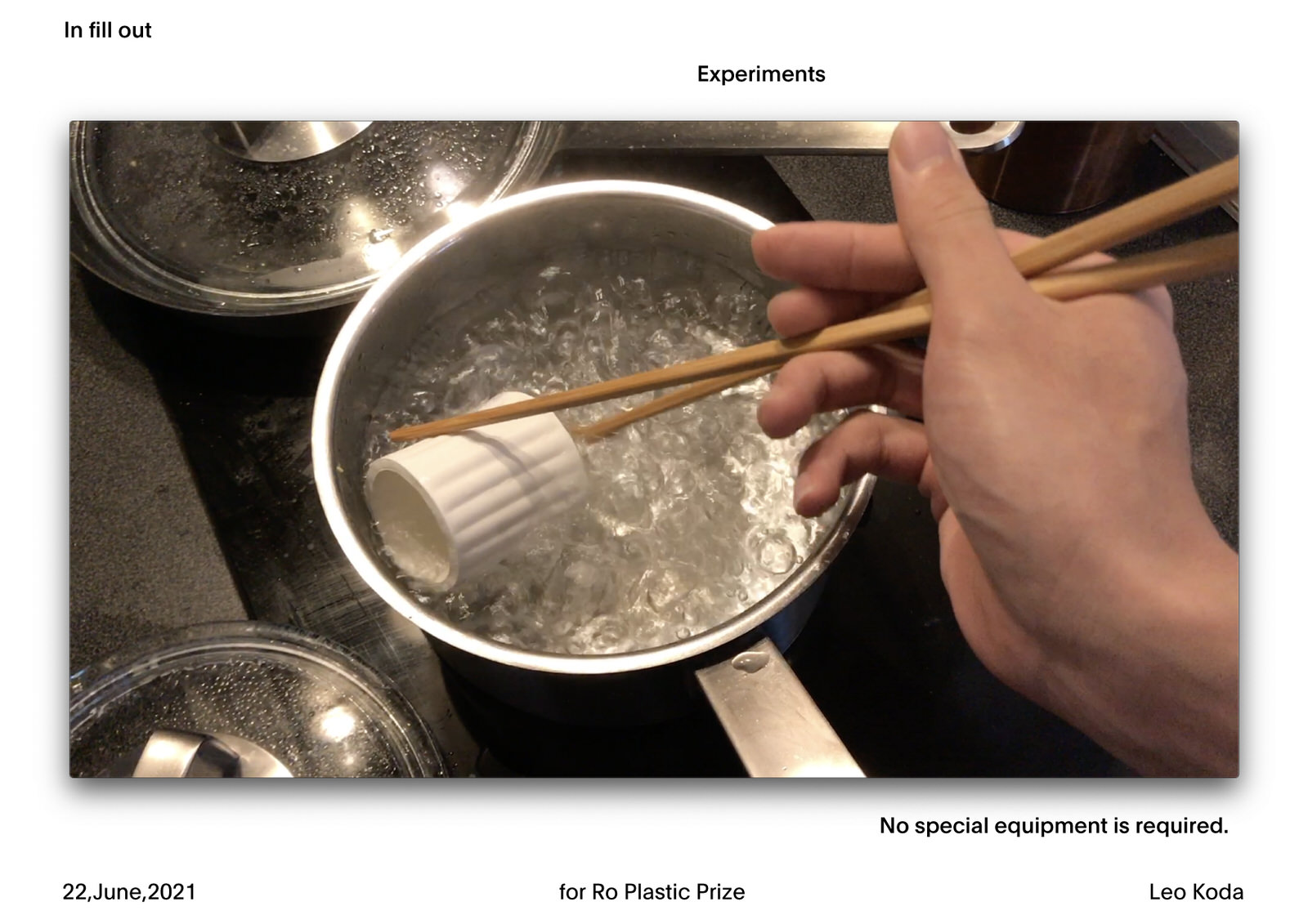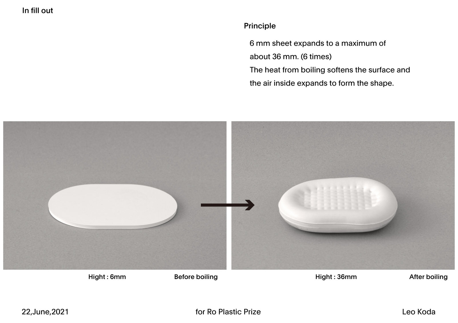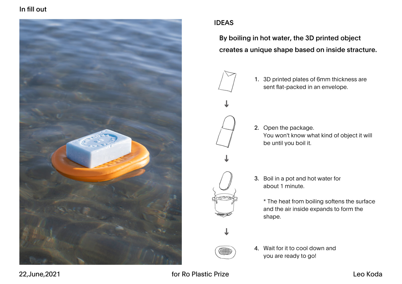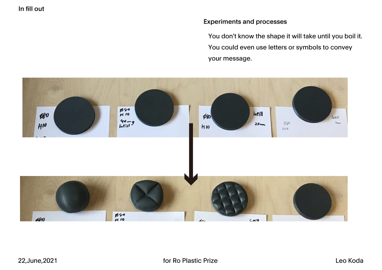 “In fill out” project is a project in which 3D printed objects are finished by boiling them in a pot. By relating the process of cooking to the process of making a product, I found a way to make it easy to process at home. As a result, by keeping the amount of material to a minimum, it is even possible to make them light enough to float on water. The ability to pack it flat enough to fit into an envelope has also made it very cost-effective to transport. Printing time and materials can be reduced by more than 95%. The new technique can be applied to a wide range of products, including vases, wall objects and coin trays. In the end, I managed to create a surface that does not look like it was made with a 3D printer.