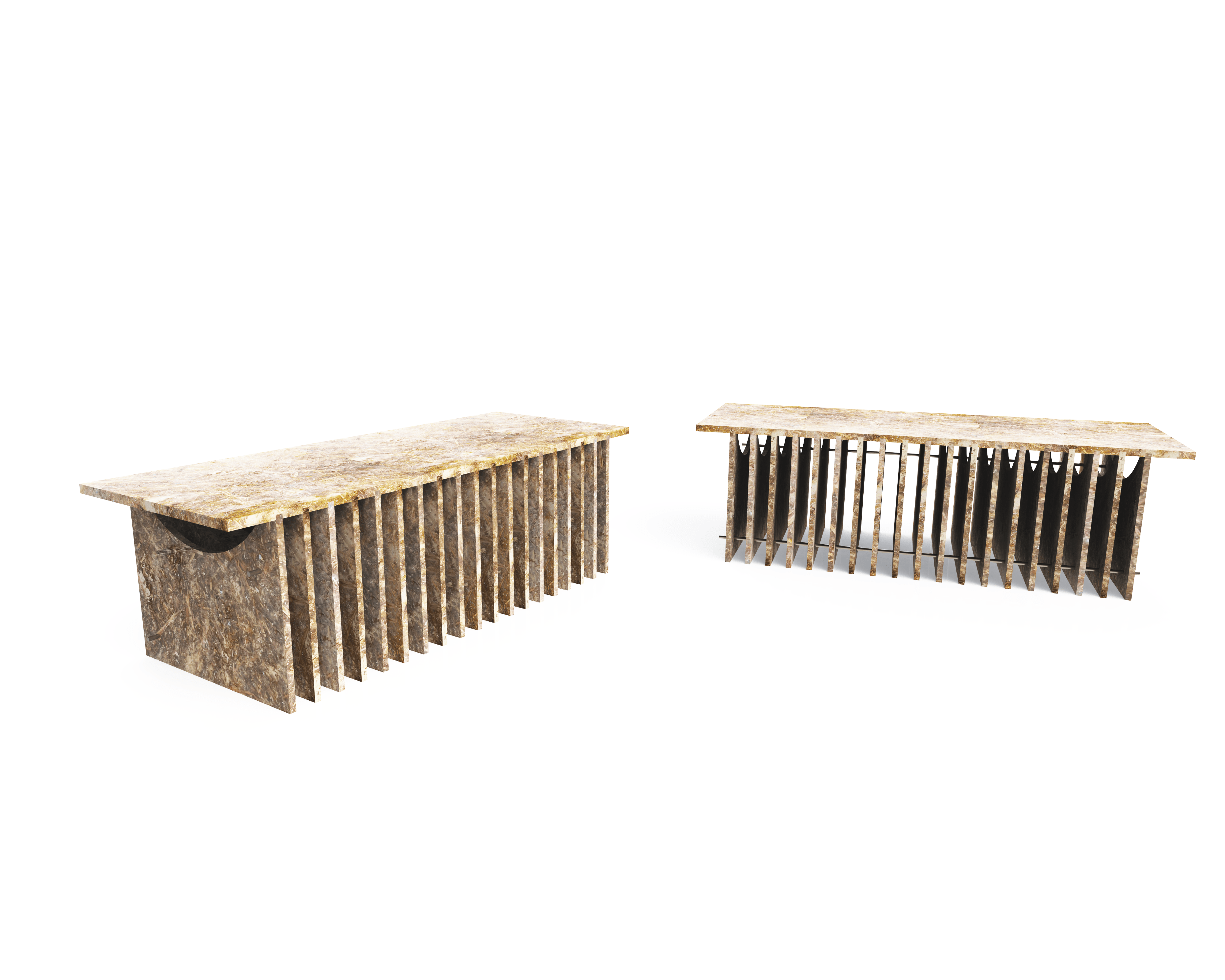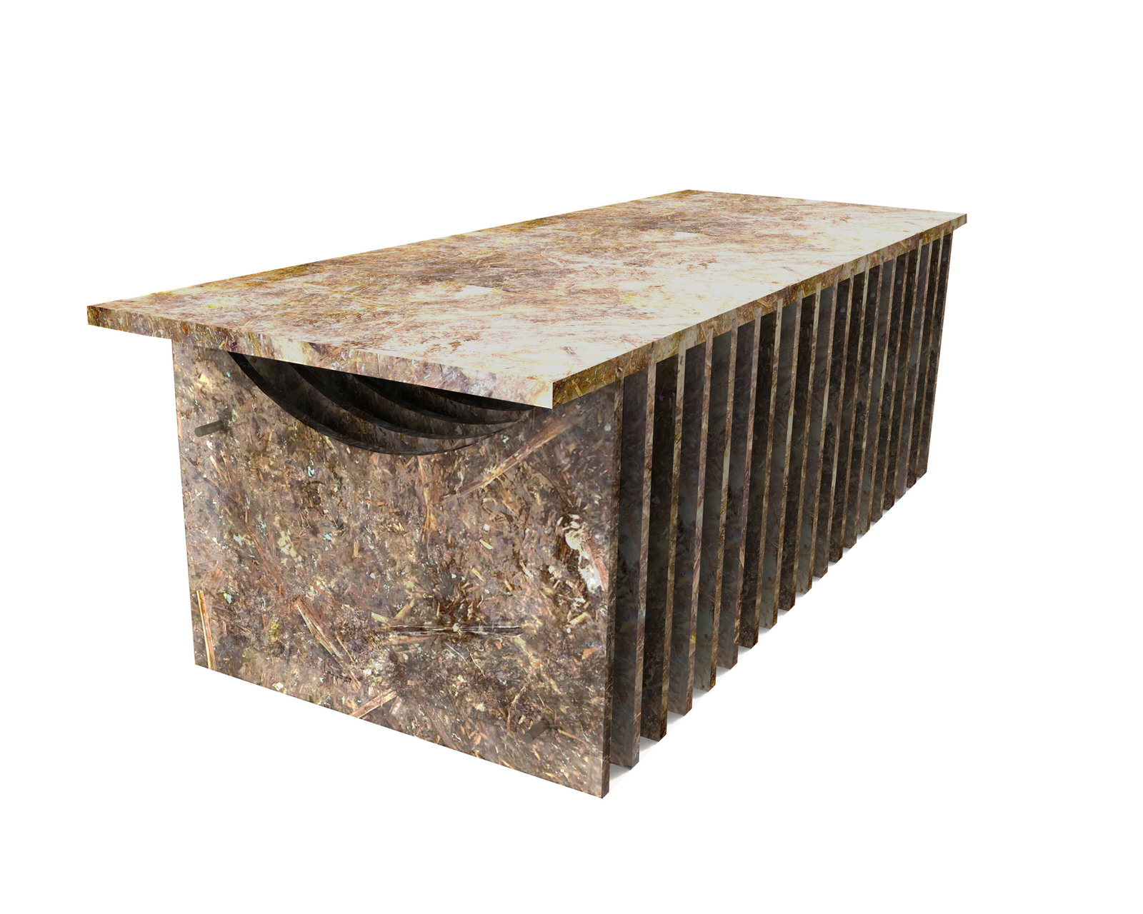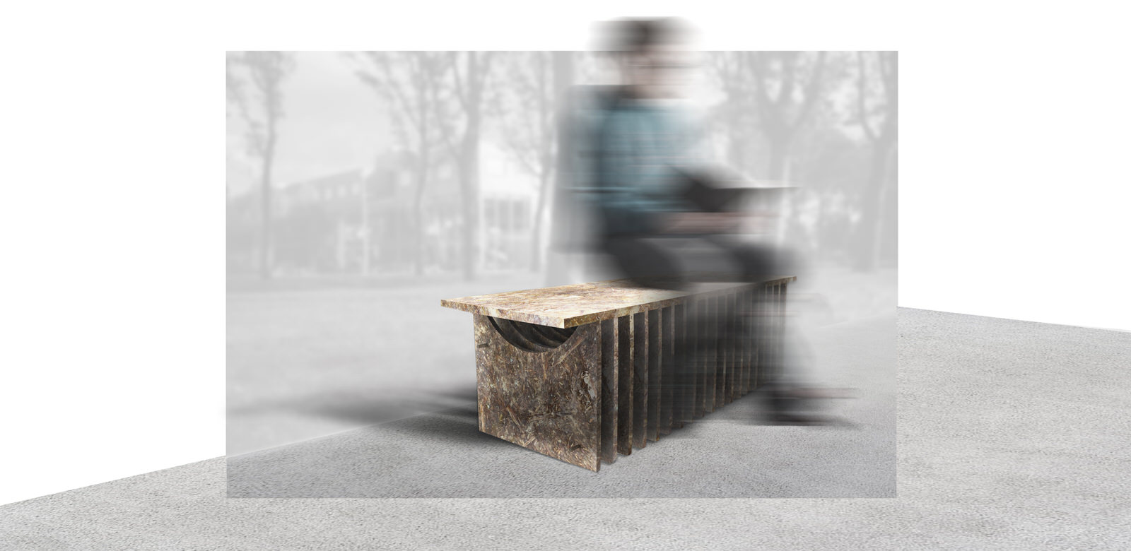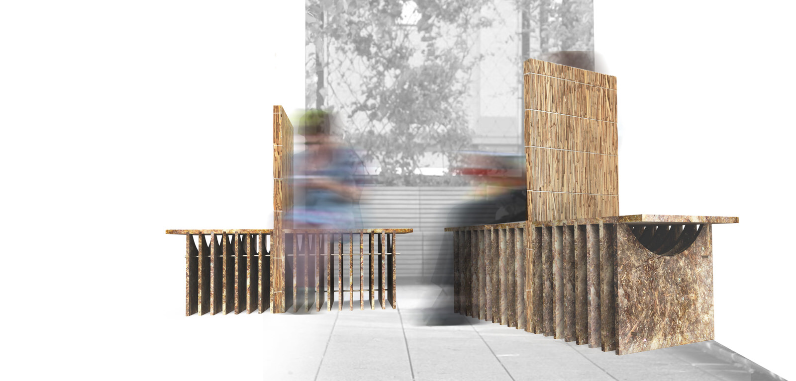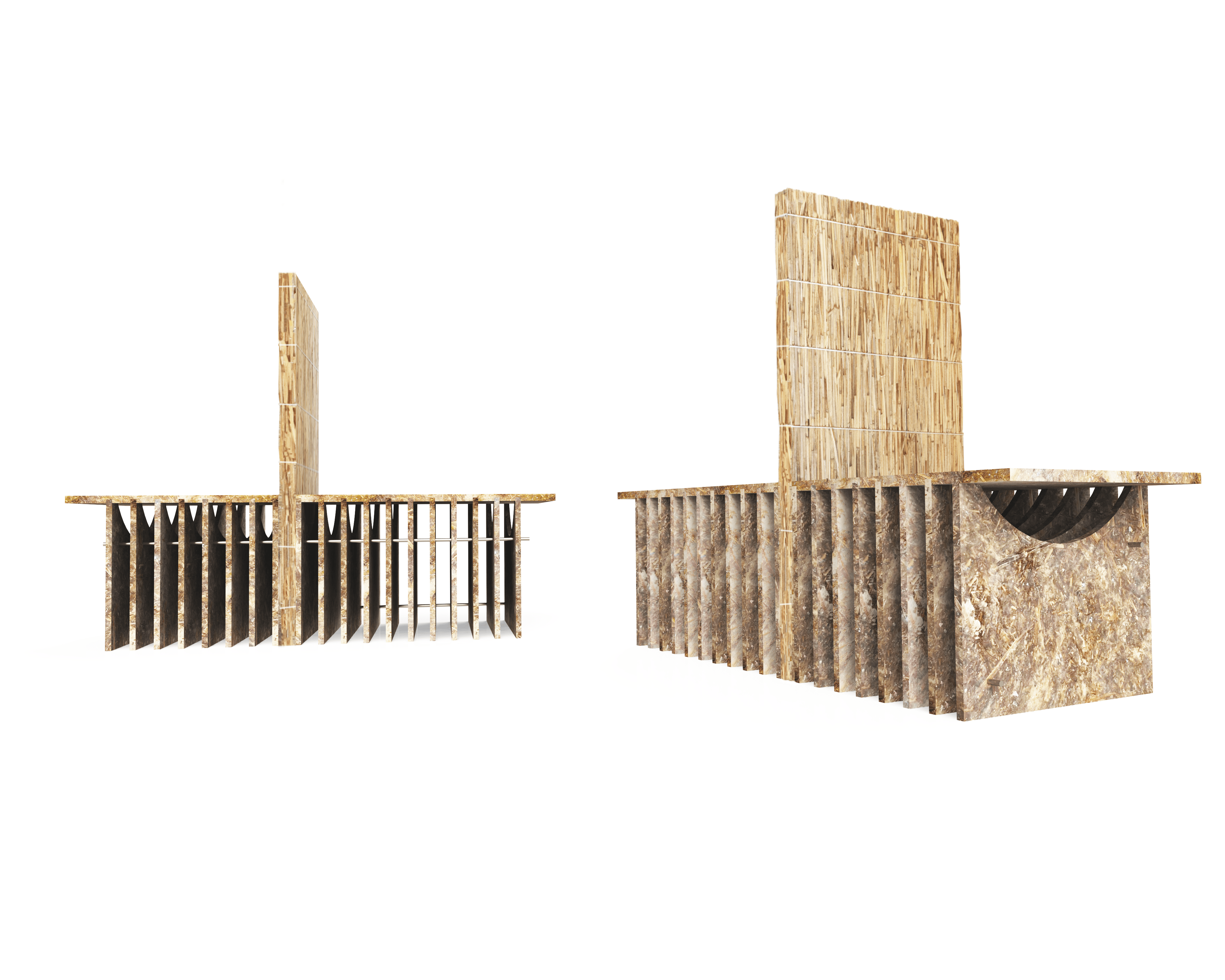The idea was born in beautiful landscape of Mazury. Reed mat creation is Dorota’s family business. Naturalex creates a sustainable material out of resources naturally growing in Mazury region in Poland. The common reed (Phragmites australis) is a dominant plant of freshwater reservoirs. Thanks to its adaptability, resistance to weather conditions and a short growing season, reed can survive in the most demanding environments. It is a cheap material that additionally cleans the environment in phytoremediation water treatment. Most of reed’s uses are to create sorted bundles of stems which are then made into mats and plate structures. Inspired by process itself and the handmade forms of equipment used in the reed mat production, we created a design, which is based on boards made of reused plastic. The waste we use are plastic threads used during a few phases of the process. Polipropylene rope is used during many processes in gardening and agriculture industries. Because of its properties and price it is very hard to be replaced by other degradable materials. Collected plastic cords have already some reed impurities: that is why they are not commonly recycled. Those leftovers can be stored or given to incineration plant. Our design solves this problem. Plastic waste collected by Naturalex is milled and used to create the base material of the boards. Material we created has unique aesthethic properties-it is semi transparent, depending on proportions of organic input. Reed pieces give unique patterns. Because of wide range of applications PP rope is a commonly seen waste that contaminates our environment. We may incorporate local farmers and producers who use the plastic threads by collecting unrecyclable waste from them. Masuria is a modular city bench. It is constructed of composite shaped board multiplied and connected by metal bars and fixing elements. Composite boards are spaced apart leaving blank space in between. This construction resembles reed straws growing in natural environment. The shape was inspired an item used in the reed processing. Bench design allows to add screen elements such as reed mat dividers. This may be used in larger public spaces where there is a high need for separating bench users. Besides reed reacts well to UV and humidity. Due to its porosity it has acoustic properties. It does not heat up during heat wave and can be an ecological outdoor shade. There is a possibility to implement light into the model to emphasize the beauty of our material.