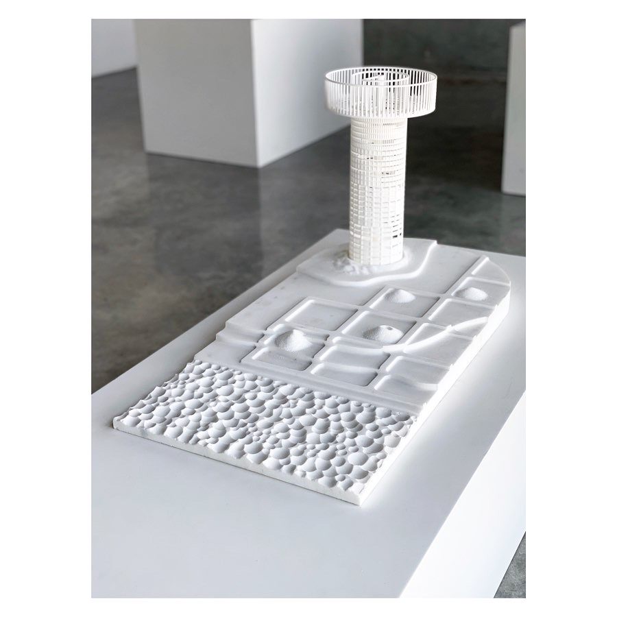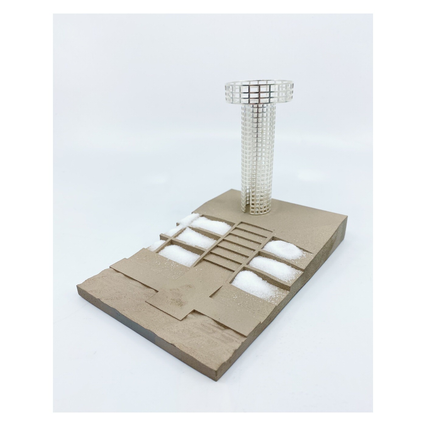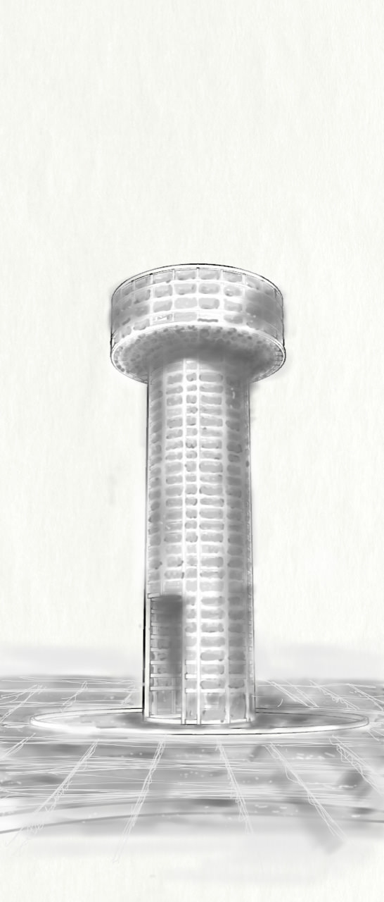 Most of the potable water in Qatar is desalinated seawater, a process that requires 5litres of oil per each cubic meter of treated water. Most desalination plants are located along the country’s west coast, resulting in theadjacent sea being approximately 30% more saline compared to the country’sremaining coastlines. Considering that Qatar is amongst the highest consumers of portable water in theworld, there is limited awareness amongst its population about the energy and adeptit requires to enable such consumption.The design of the Salt Tower was catalyzed by the above. Placed by Qatar’s west coast, the tower-design is surrounded by a salt farm, whichprovides the raw material – the bricks – that make up the bulk of the Salt Tower’s walls.Here, however, the tectonic support is, in a sense, ‘reversed’, and is actually providedby the gridded ‘mortar’ that surrounds the hollows that support the salt bricks.Maintaining this wall of salt would require constant upkeep. The salt farm provides thematerial, but human labour would be needed to both fabricate the bricks and to patchthe cavities resulting from seasonal rains and general erosion.