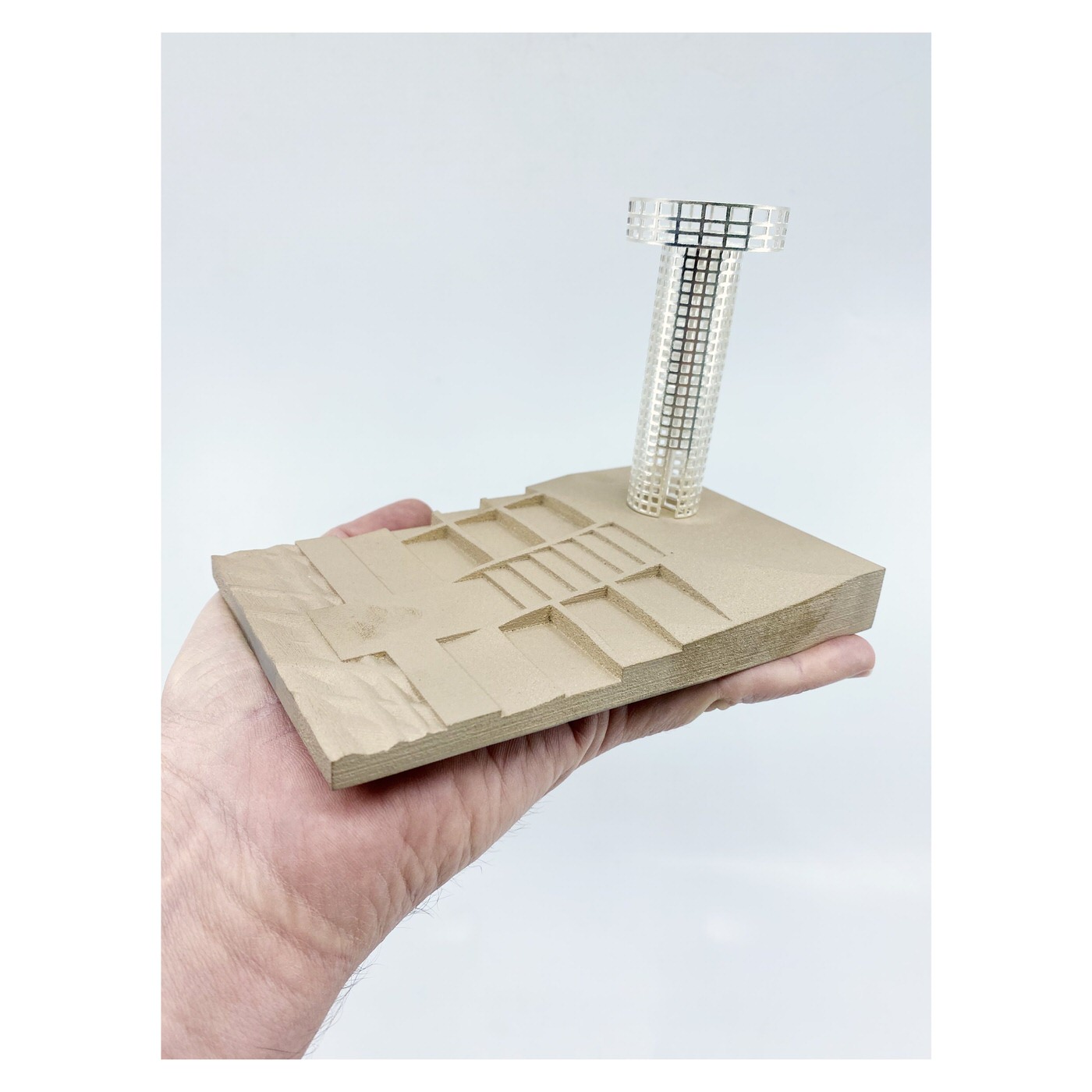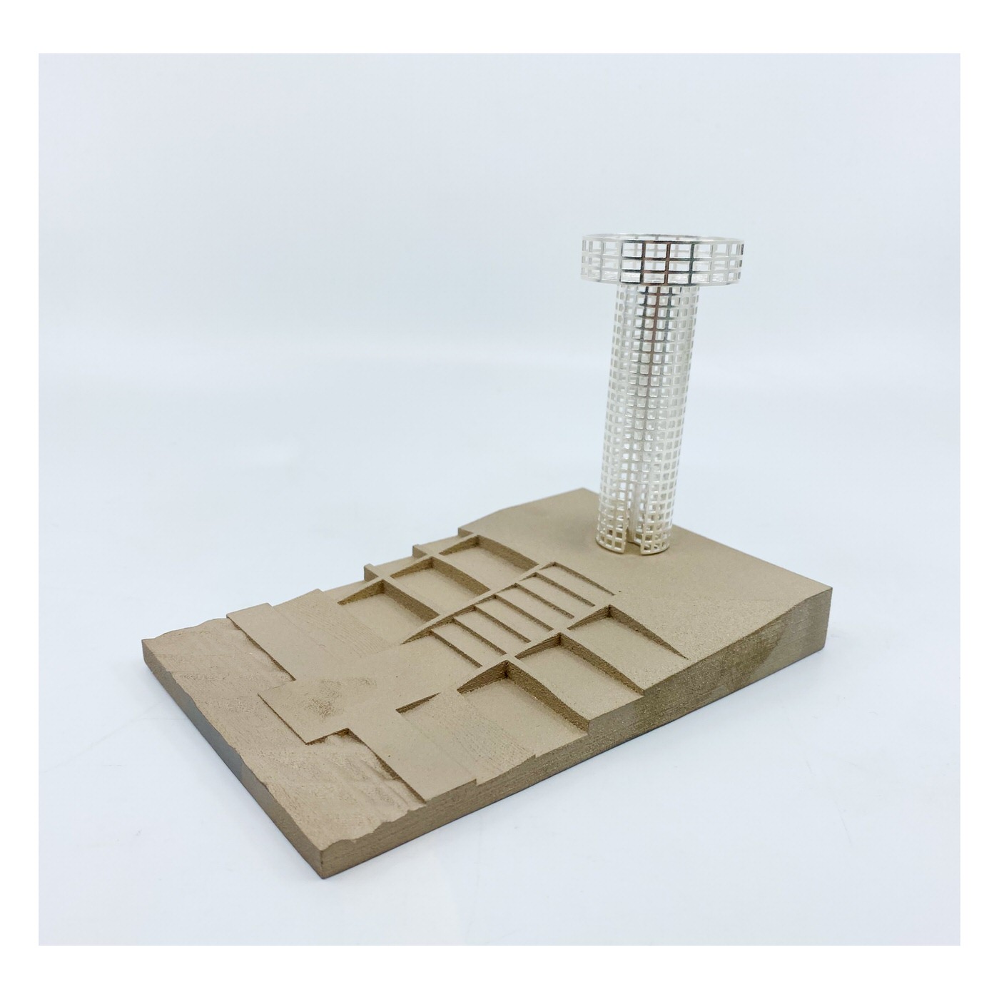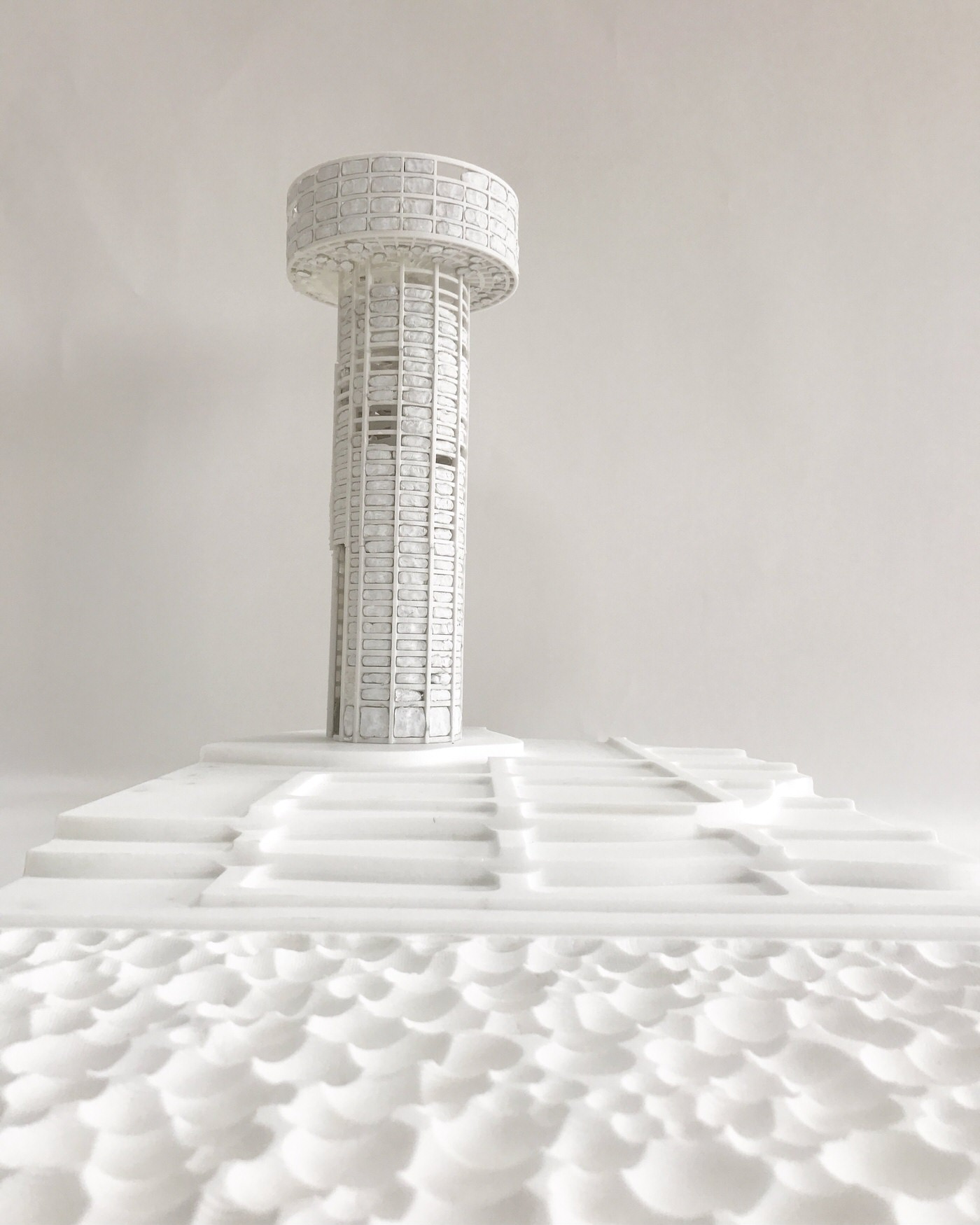 Most of the potable water in Qatar is desalinated seawater, a process that requires 5litres of oil per each cubic meter of treated water. Most desalination plants are located along the country’s west coast, resulting in theadjacent sea being approximately 30% more saline compared to the country’sremaining coastlines. Considering that Qatar is amongst the highest consumers of portable water in theworld, there is limited awareness amongst its population about the energy and adeptit requires to enable such consumption.The design of the Salt Tower was catalyzed by the above. Placed by Qatar’s west coast, the tower-design is surrounded by a salt farm, whichprovides the raw material – the bricks – that make up the bulk of the Salt Tower’s walls.Here, however, the tectonic support is, in a sense, ‘reversed’, and is actually providedby the gridded ‘mortar’ that surrounds the hollows that support the salt bricks.Maintaining this wall of salt would require constant upkeep. The salt farm provides thematerial, but human labour would be needed to both fabricate the bricks and to patchthe cavities resulting from seasonal rains and general erosion.