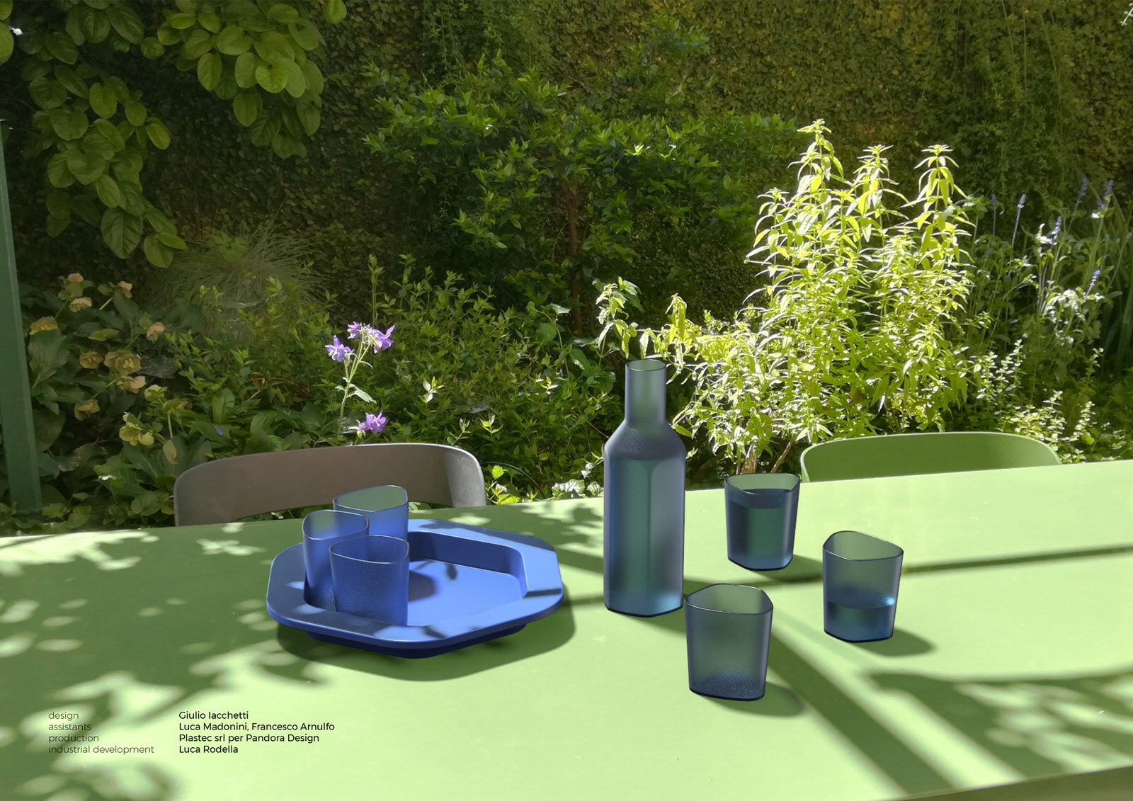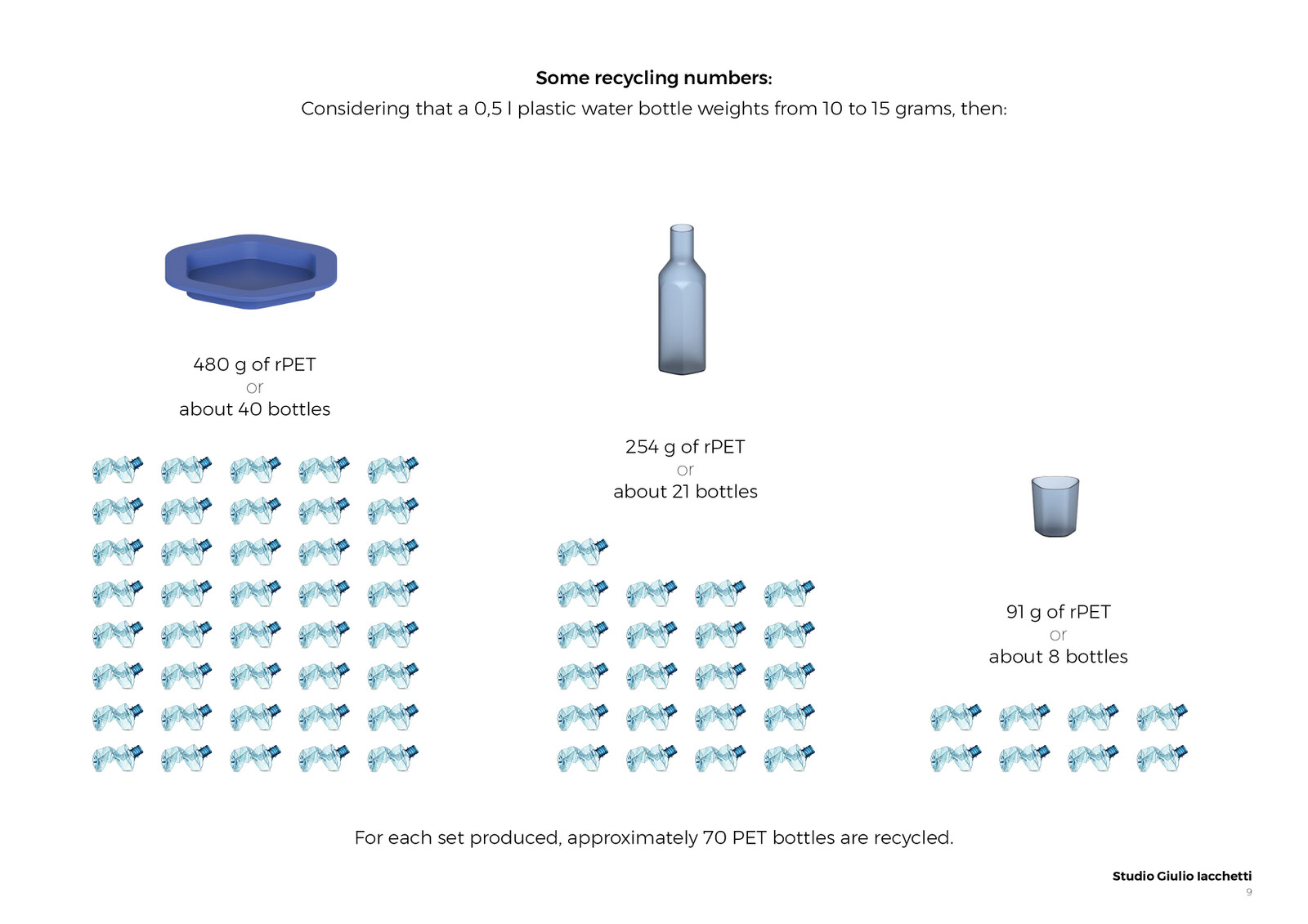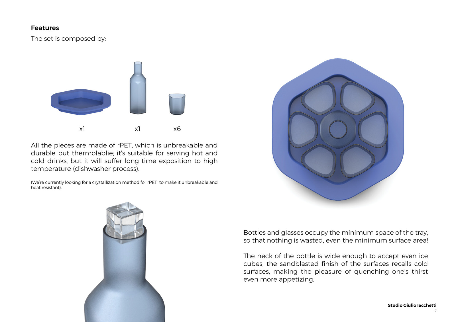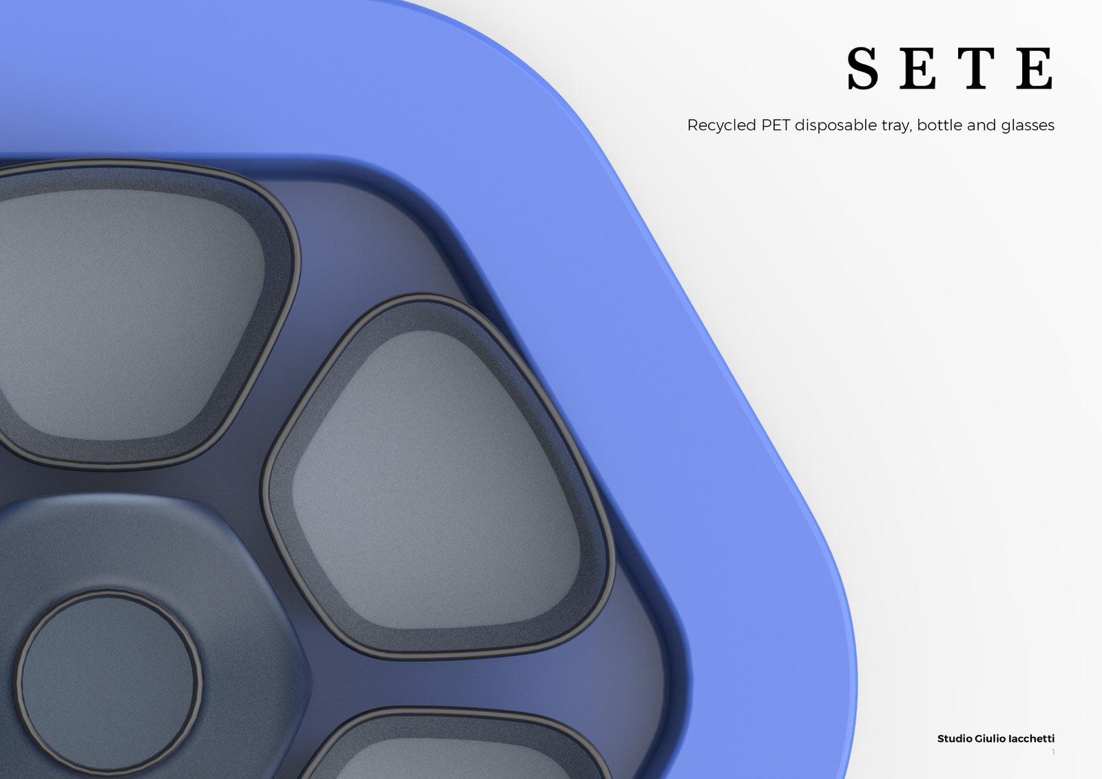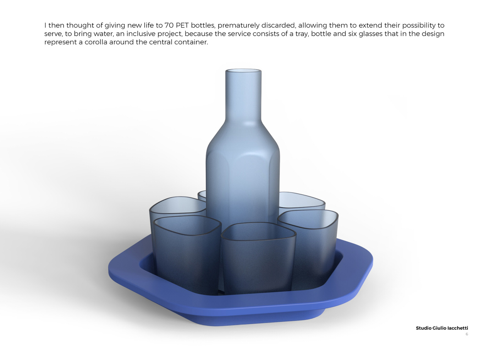 I look at PET water bottles emptied and then thrown away. Just one chance in a lifetime to prove their value and their capacity not only to contain but to exist. The enormous quantity of plastic objects that crowd the sea and rivers is not only a disfigurement to the planet, but it is the denial to a “good” material such as plastic to prove its value in time, so why not grant also objects to live more seasons of life? I then thought of giving new life to 70 PET bottles, allowing them to extend their possibility to serve, to bring water; an inclusive project, a service that consists of a tray, bottle and six glasses that in the design represent a corolla around the central container. The project purpose is transforming plastic bottles from disposable to reusable objects, acting on the recycling of the same material and the creation of new forms, while maintaining the intended use of serving water and beverages.