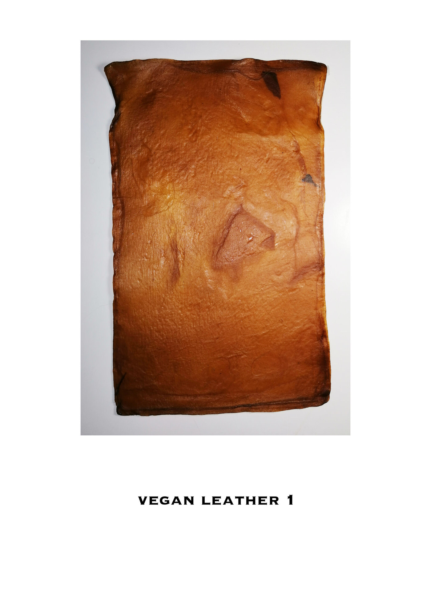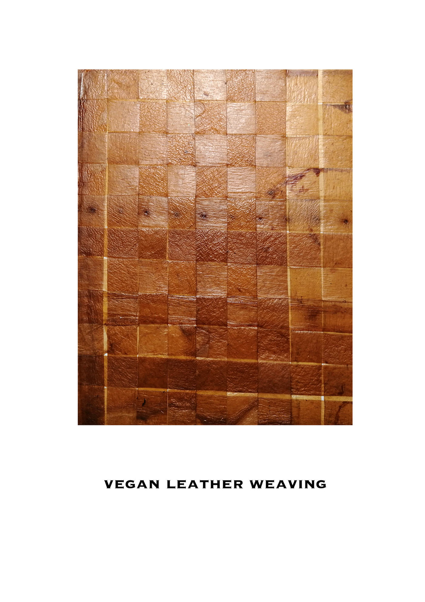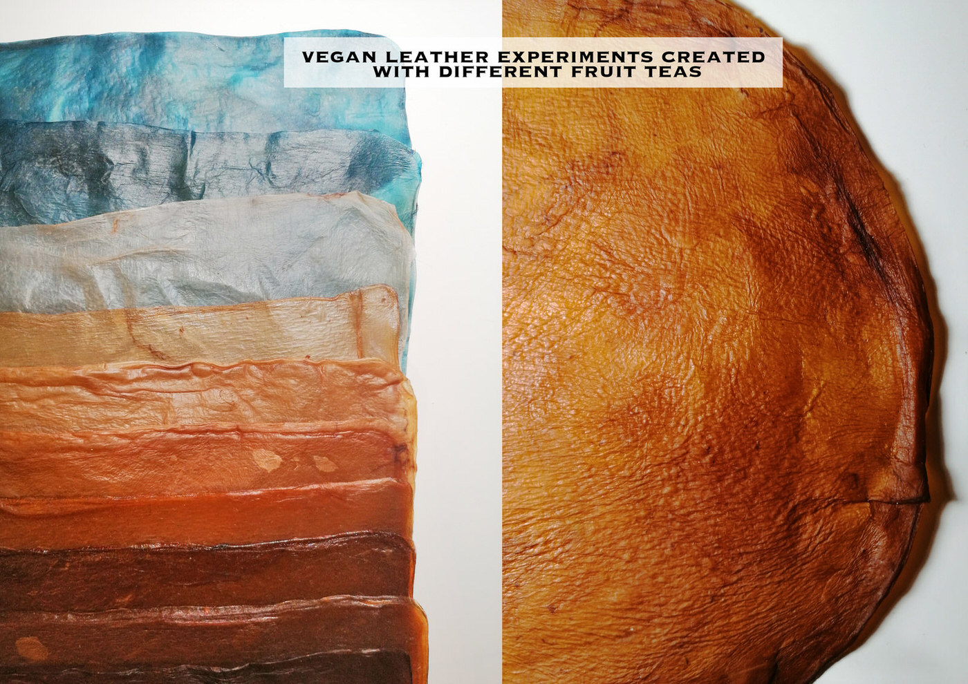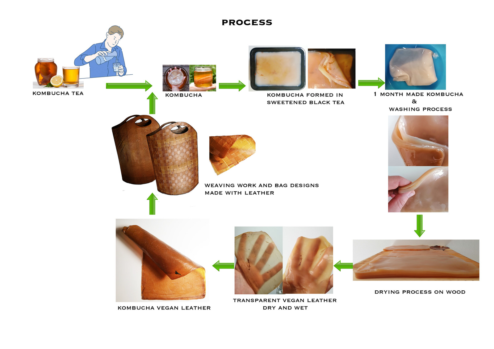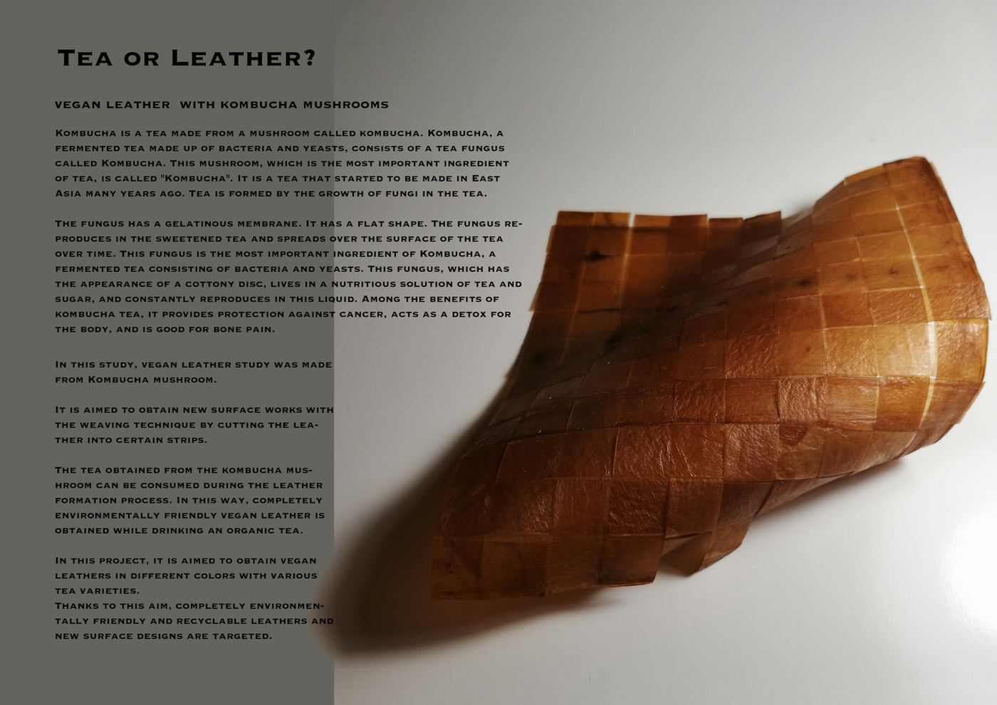 Kombucha is a tea made from a mushroom called kombucha. Kombucha, a fermented tea made up of bacteria and yeasts, consists of a tea fungus called Kombucha. This mushroom, which is the most important ingredient of tea, is called “Kombucha”. It is a tea that started to be made in East Asia many years ago. Tea is formed by the growth of fungi in the tea. The fungus has a gelatinous membrane. It has a flat shape. The fungus reproduces in the sweetened tea and spreads over the surface of the tea over time. This fungus is the most important ingredient of Kombucha, a fermented tea consisting of bacteria and yeasts. This fungus, which has the appearance of a cottony disc, lives in a nutritious solution of tea and sugar, and constantly reproduces in this liquid. Among the benefits of kombucha tea, it provides protection against cancer, acts as a detox for the body, and is good for bone pain. In this study, vegan leather study was made from Kombucha mushroom. It is aimed to obtain new surface works with the weaving technique by cutting the leather into certain strips. The tea obtained from the kombucha mushroom can be consumed during the leather formation process. In this way, completely environmentally friendly vegan leather is obtained while drinking an organic tea. In this project, it is aimed to obtain vegan leathers in different colors with various tea varieties. Thanks to this aim, completely environmentally friendly and recyclable leathers and new surface designs are targeted.