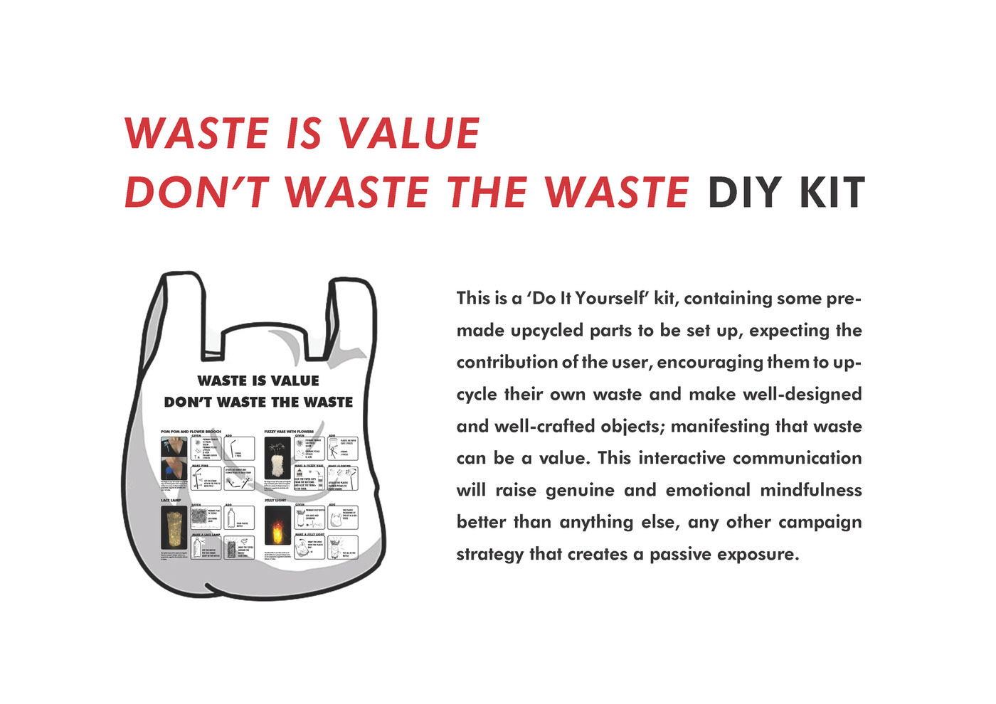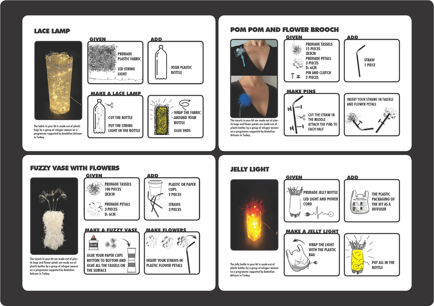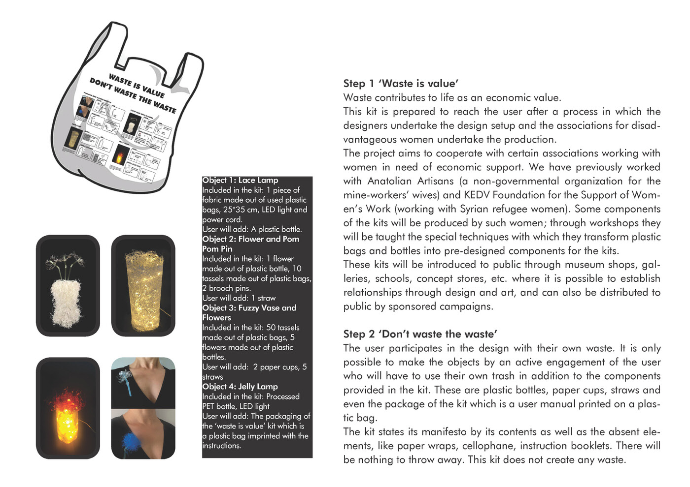 This is a DIY kit, having two stages;Step 1 ‘Waste is value’Waste contributes to life as an economic value.This kit is prepared to reach the user after a process in which the designers undertakethe design setup and the associations for disadvantageous women undertake theproduction.The project aims to cooperate with certain associations working with women in needof economic support. We have previously worked with Anatolian Artisans (anon-governmental organization for the mine-workers’ wives) and KEDV Foundation forthe Support of Women’s Work (working with Syrian refugee women). Somecomponents of the kits will be produced by such women; through workshops they willbe taught the special techniques with which they transform plastic bags and bottlesinto pre-designed components for the kits.These kits will be introduced to public through museum shops, galleries, schools,concept stores, etc. where it is possible to establish relationships through design andart, and can also be distributed to public by sponsored campaigns.Step 2 ‘Don’t waste the waste’The user participates in the design with their own waste. It is only possible to makethe objects by an active engagement of the user who will have to use their own trashin addition to the components provided in the kit. These are plastic bottles, papercups, straws and even the package of the kit which is a user manual printed on aplastic bag.The kit states its manifesto by its contents as well as the absent elements, like paperwraps, cellophane, instruction booklets. There will be nothing to throw away. This kitdoes not create any waste.