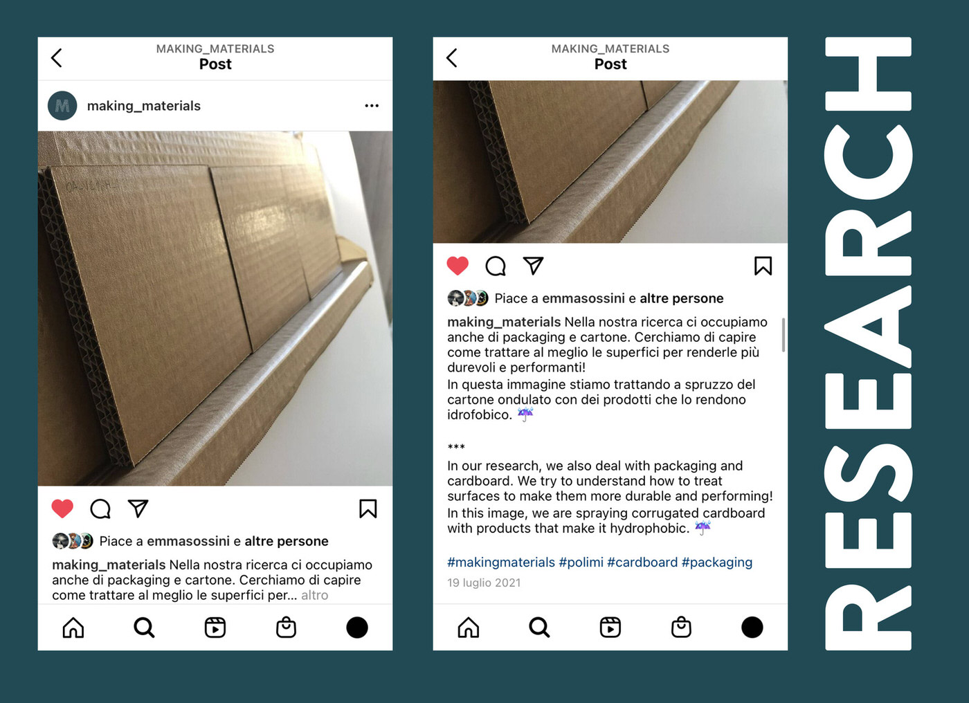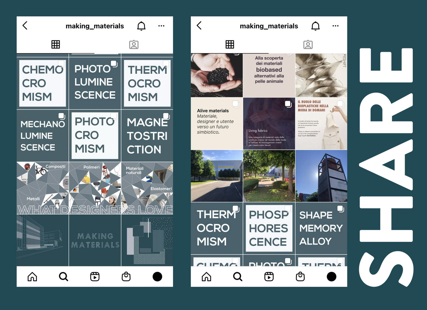 Making Materials is a research group of Politecnico di Milano dealing with materials and design. Why did we open the Making Materials social profile? Because it would be stupid not to. Our account was born nearly a year ago in an atmosphere of distance and blended learning. We taught a course on nanotechnology and functional materials and wanted to share the same experience of proximity both with students in attendance and the ones at home. At the same time, we could not use physical samples of materials, so it would have been hard to introduce the students to some of the features. So we started to share extra content from our course to spread knowledge and reach more people as possible. After that experience, we thought that the Instagram profile would be an opportunity to share not only the students’ activities but also for disseminating our research projects, interests and vision. We started to publish some posts to describe our research, share pages, inspiring posts about sustainability, along with our content. Every day the team deals with materials sustainability, working on packaging projects, teaching students, looking for new sustainable materials. On Making Materials, we share some of our new materials, our selection from the FuoriSalone 2021, our events and news about sustainability. Moreover, we try to find the perfect material to celebrate a particular festivity. For the future, we want to expand content by publishing more of our research, trying to arrange interviews with some of the designers or companies we share material interests with, and becoming a reference for our students but also for designers and curious people on the topic. The pandemic has accelerated the process of dematerialization, and modern life requires speed. The way of learning has changed from a traditional one, more physical and in-depth to learning by doing modality, more experiential and dynamic. Now we are facing another change: in the era of digital learning, we can reach people with pills and small insight every time they use their smartphones during their free time.