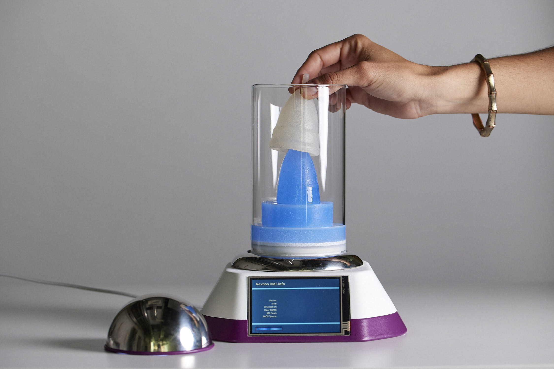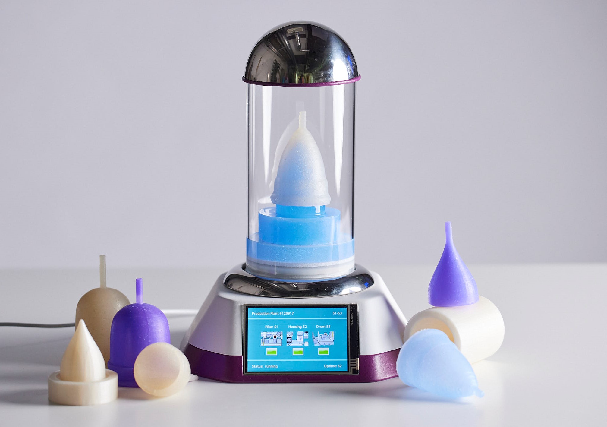 The Soothing Cup is a speculative project that comprises a menstrual cup and an incubator. A seaweed-based hydrogel turns the cup into a bio-membrane that can interact with the vaginal environment, while the incubator enables users to grow their own anti-inflammatory bacteria on their personal menstrual cups to reduce periods discomfort. The level of care required in this ritual creates an intimate connection between the menstruator and the cup, reducing the desire to purchase single-use hygiene products whilst challenging the societal stigma around periods.